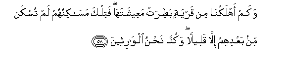58. Wakam ahlakna min qaryatin batirat maAAeeshataha fatilka masakinuhum lam tuskan min baAAdihim illa qaleelan wakunna nahnu alwaritheena