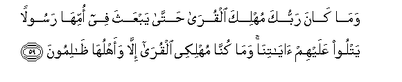 59. Wama kana rabbuka muhlika alqura hatta yabAAatha fee ommiha rasoolan yatloo AAalayhim ayatina wama kunna muhlikee alqura illa waahluha thalimoona