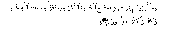 60. Wama ooteetum min shay-in famataAAu alhayati alddunya wazeenatuha wama AAinda Allahi khayrun waabqa afala taAAqiloona