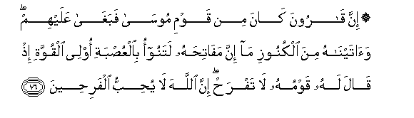 76. Inna qaroona kana min qawmi moosa fabagha AAalayhim waataynahu mina alkunoozi ma inna mafatihahu latanoo-o bialAAusbati olee alquwwati ith qala lahu qawmuhu la tafrah inna Allaha la yuhibbu alfariheena