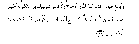 77. Waibtaghi feema ataka Allahu alddara al-akhirata wala tansa naseebaka mina alddunya waahsin kama ahsana Allahu ilayka wala tabghi alfasada fee al-ardi inna Allaha la yuhibbu almufsideena