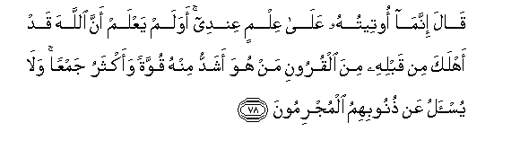 78. Qala innama ooteetuhu AAala AAilmin AAindee awa lam yaAAlam anna Allaha qad ahlaka min qablihi mina alqurooni man huwa ashaddu minhu quwwatan waaktharu jamAAan wala yus-alu AAan thunoobihimu almujrimoona