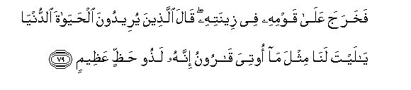 79. Fakharaja AAala qawmihi fee zeenatihi qala allatheena yureedoona alhayata alddunya ya layta lana mithla ma ootiya qaroonu innahu lathoo haththin AAatheemin