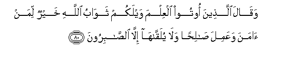 80. Waqala allatheena ootoo alAAilma waylakum thawabu Allahi khayrun liman amana waAAamila salihan wala yulaqqaha illa alssabiroona