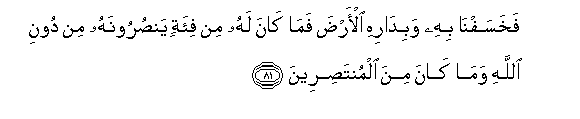 81. Fakhasafna bihi wabidarihi al-arda fama kana lahu min fi-atin yansuroonahu min dooni Allahi wama kana mina almuntasireena