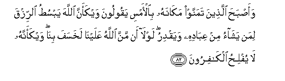 82. Waasbaha allatheena tamannaw makanahu bial-amsi yaqooloona waykaanna Allaha yabsutu alrrizqa liman yashao min AAibadihi wayaqdiru lawla an manna Allahu AAalayna lakhasafa bina waykaannahu la yuflihu alkafiroona