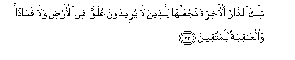 83. Tilka alddaru al-akhiratu najAAaluha lillatheena la yureedoona AAuluwwan fee al-ardi wala fasadan waalAAaqibatu lilmuttaqeena