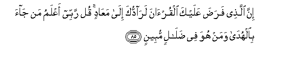 85. Inna allathee farada AAalayka alqur-ana laradduka ila maAAadin qul rabbee aAAlamu man jaa bialhuda waman huwa fee dalalin mubeenin
