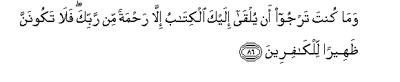 86. Wama kunta tarjoo an yulqa ilayka alkitabu illa rahmatan min rabbika fala takoonanna thaheeran lilkafireena