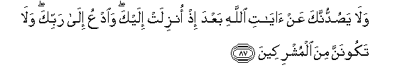 87. Wala yasuddunnaka AAan ayati Allahi baAAda ith onzilat ilayka waodAAu ila rabbika wala takoonanna mina almushrikeena
