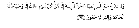 88. Wala tadAAu maAAa Allahi ilahan akhara la ilaha illa huwa kullu shay-in halikun illa wajhahu lahu alhukmu wa-ilayhi turjaAAoona