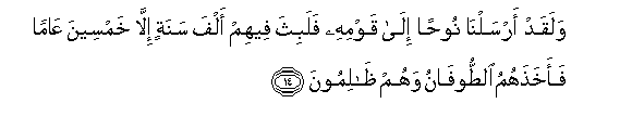 14. Walaqad arsalna noohan ila qawmihi falabitha feehim alfa sanatin illa khamseena AAaman faakhathahumu alttoofanu wahum thalimoona