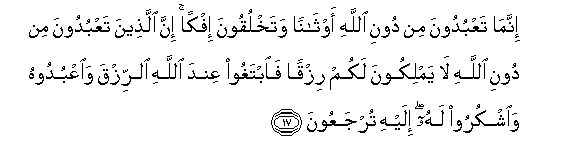 17. Innama taAAbudoona min dooni Allahi awthanan watakhluqoona ifkan inna allatheena taAAbudoona min dooni Allahi la yamlikoona lakum rizqan faibtaghoo AAinda Allahi alrrizqa waoAAbudoohu waoshkuroo lahu ilayhi turjaAAoona