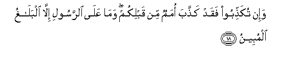18. Wa-in tukaththiboo faqad kaththaba omamun min qablikum wama AAala alrrasooli illa albalaghu almubeenu