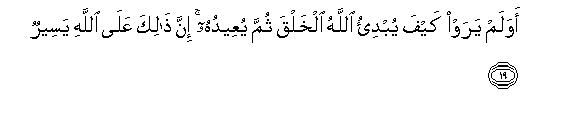 19. Awa lam yaraw kayfa yubdi-o Allahu alkhalqa thumma yuAAeeduhu inna thalika AAala Allahi yaseerun