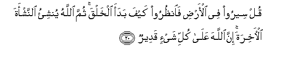 20. Qul seeroo fee al-ardi faonthuroo kayfa badaa alkhalqa thumma Allahu yunshi-o alnnash-ata al-akhirata inna Allaha AAala kulli shay-in qadeerun