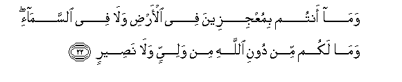 22. Wama antum bimuAAjizeena fee al-ardi wala fee alssama-i wama lakum min dooni Allahi min waliyyin wala naseerin