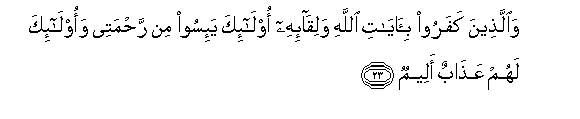 23. Waallatheena kafaroo bi-ayati Allahi waliqa-ihi ola-ika ya-isoo min rahmatee waola-ika lahum AAathabun aleemun