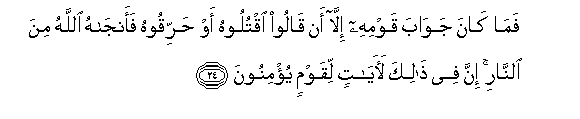 24. Fama kana jawaba qawmihi illa an qaloo oqtuloohu aw harriqoohu faanjahu Allahu mina alnnari inna fee thalika laayatin liqawmin yu/minoona