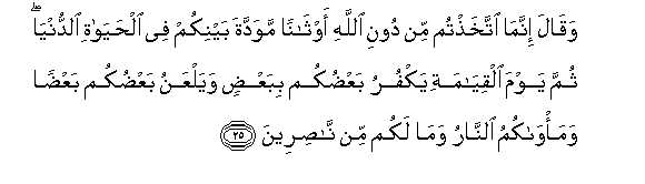 25. Waqala innama ittakhathtum min dooni Allahi awthanan mawaddata baynikum fee alhayati alddunya thumma yawma alqiyamati yakfuru baAAdukum bibaAAdin wayalAAanu baAAdukum baAAdan wama-wakumu alnnaru wama lakum min nasireena