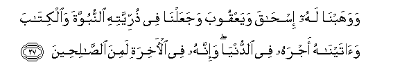 27. Wawahabna lahu ishaqa wayaAAqooba wajaAAalna fee thurriyyatihi alnnubuwwata waalkitaba waataynahu ajrahu fee alddunya wa-innahu fee al-akhirati lamina alssaliheena