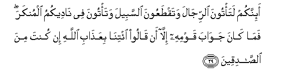 29. A-innakum lata/toona alrrijala wataqtaAAoona alssabeela wata/toona fee nadeekumu almunkara fama kana jawaba qawmihi illa an qaloo i/tina biAAathabi Allahi in kunta mina alssadiqeena