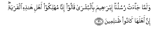 31. Walamma jaat rusuluna ibraheema bialbushra qaloo inna muhlikoo ahli hathihi alqaryati inna ahlaha kanoo thalimeena