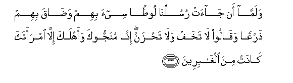 33. Walamma an jaat rusuluna lootan see-a bihim wadaqa bihim tharAAan waqaloo la takhaf wala tahzan inna munajjooka waahlaka illa imraataka kanat mina alghabireena