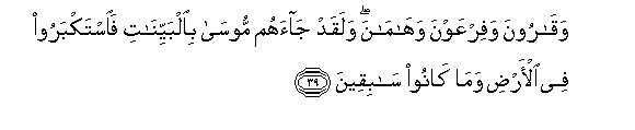 39. Waqaroona wafirAAawna wahamana walaqad jaahum moosa bialbayyinati faistakbaroo fee al-ardi wama kanoo sabiqeena