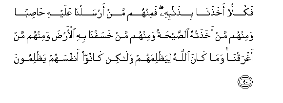 40. Fakullan akhathna bithanbihi faminhum man arsalna AAalayhi hasiban waminhum man akhathat-hu alssayhatu waminhum man khasafna bihi al-arda waminhum man aghraqna wama kana Allahu liyathlimahum walakin kanoo anfusahum yathlimoona