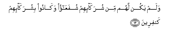 13. Walam yakun lahum min shuraka-ihim shufaAAao wakanoo bishuraka-ihim kafireena