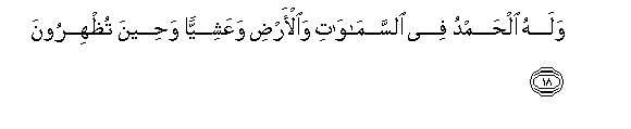 18. Walahu alhamdu fee alssamawati waal-ardi waAAashiyyan waheena tuthhiroona