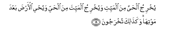 19. Yukhriju alhayya mina almayyiti wayukhriju almayyita mina alhayyi wayuhyee al-arda baAAda mawtiha wakathalika tukhrajoona