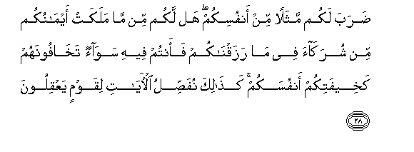 28. Daraba lakum mathalan min anfusikum hal lakum mimma malakat aymanukum min shurakaa fee ma razaqnakum faantum feehi sawaon takhafoonahum kakheefatikum anfusakum kathalika nufassilu al-ayati liqawmin yaAAqiloona