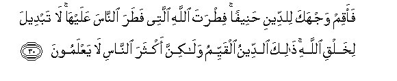30. Faaqim wajhaka lilddeeni haneefan fitrata Allahi allatee fatara alnnasa AAalayha la tabdeela likhalqi Allahi thalika alddeenu alqayyimu walakinna akthara alnnasi la yaAAlamoona