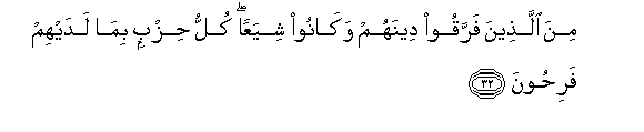 32. Mina allatheena farraqoo deenahum wakanoo shiyaAAan kullu hizbin bima ladayhim farihoona
