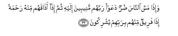 33. Wa-itha massa alnnasa durrun daAAaw rabbahum muneebeena ilayhi thumma itha athaqahum minhu rahmatan itha fareequn minhum birabbihim yushrikoona