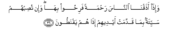 36. Waitha athaqna alnnasa rahmatan farihoo biha wa-in tusibhum sayyi-atun bima qaddamat aydeehim itha hum yaqnatoona