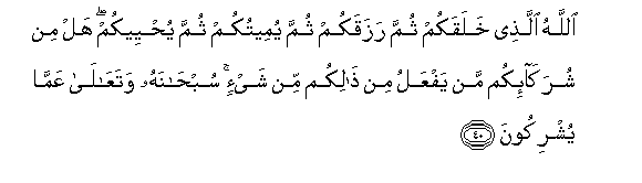 40. Allahu allathee khalaqakum thumma razaqakum thumma yumeetukum thumma yuhyeekum hal min shuraka-ikum man yafAAalu min thalikum min shay-in subhanahu wataAAala AAamma yushrikoona
