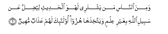 6. Wamina alnnasi man yashtaree lahwa alhadeethi liyudilla AAan sabeeli Allahi bighayri AAilmin wayattakhithaha huzuwan ola-ika lahum AAathabun muheenun
