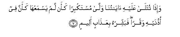 7. Wa-itha tutla AAalayhi ayatuna walla mustakbiran kaan lam yasmaAAha kaanna fee othunayhi waqran fabashshirhu biAAathabin aleemin