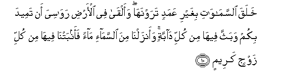 10. Khalaqa alssamawati bighayri AAamadin tarawnaha waalqa fee al-ardi rawasiya an tameeda bikum wabaththa feeha min kulli dabbatin waanzalna mina alssama-i maan faanbatna feeha min kulli zawjin kareemin