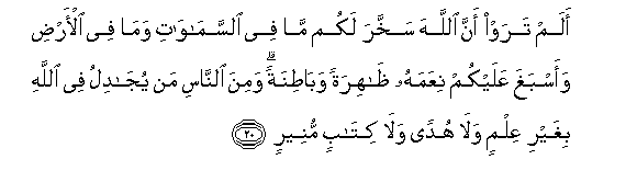 20. Alam taraw anna Allaha sakhkhara lakum ma fee alssamawati wama fee al-ardi waasbagha AAalaykum niAAamahu thahiratan wabatinatan wamina alnnasi man yujadilu fee Allahi bighayri AAilmin wala hudan wala kitabin muneerin