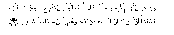 21. Wa-itha qeela lahumu ittabiAAoo ma anzala Allahu qaloo bal nattabiAAu ma wajadna AAalayhi abaana awa law kana alshshaytanu yadAAoohum ila AAathabi alssaAAeeri