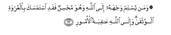 22. Waman yuslim wajhahu ila Allahi wahuwa muhsinun faqadi istamsaka bialAAurwati alwuthqa wa-ila Allahi AAaqibatu al-omoori