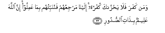23. Waman kafara fala yahzunka kufruhu ilayna marjiAAuhum fanunabbi-ohum bima AAamiloo inna Allaha AAaleemun bithati alssudoori