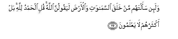 25. Wala-in saaltahum man khalaqa alssamawati waal-arda layaqoolunna Allahu quli alhamdu lillahi bal aktharuhum la yaAAlamoona