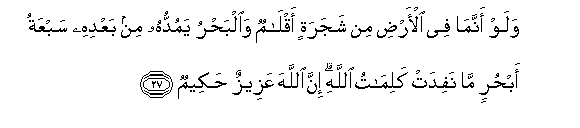 27. Walaw annama fee al-ardi min shajaratin aqlamun waalbahru yamudduhu min baAAdihi sabAAatu abhurin ma nafidat kalimatu Allahi inna Allaha AAazeezun hakeemun