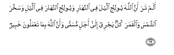 29. Alam tara anna Allaha yooliju allayla fee alnnahari wayooliju alnnahara fee allayli wasakhkhara alshshamsa waalqamara kullun yajree ila ajalin musamman waanna Allaha bima taAAmaloona khabeerun