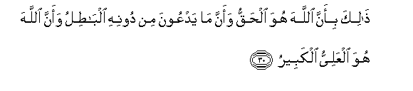 30. Thalika bi-anna Allaha huwa alhaqqu waanna ma yadAAoona min doonihi albatilu waanna Allaha huwa alAAaliyyu alkabeeru